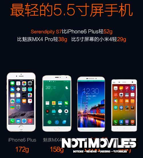 El Serendipity S7 es realmente un teléfono revolucionario, ya que la empresa afirma que cuenta con los biseles estrechos alrededor de 0,7 mm y ademas cuenta con la mejor pantalla en relación al cuerpo. Otro detalle importante es que es súper ligero, a pesar de su gran pantalla de 5,5 pulgadas sólo pesa 120 gramos. Eso es bastante impresionante teniendo en cuenta todas las especificaciones con las que cuenta.