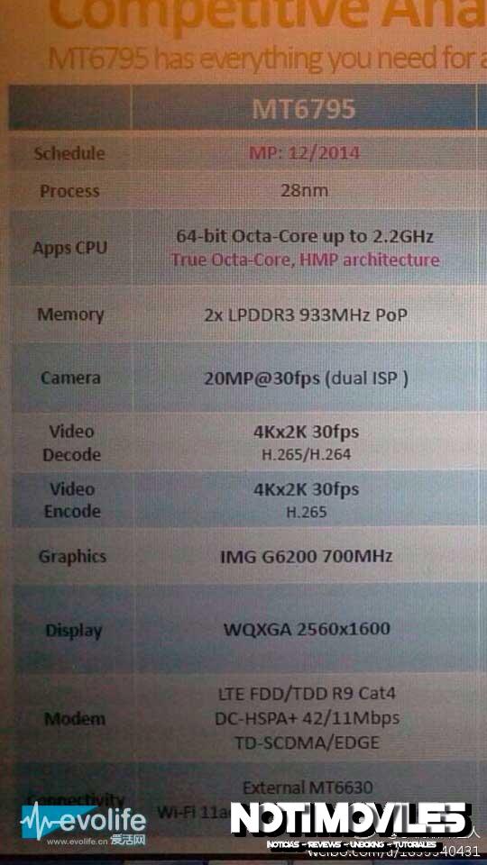 MT6795, Nuevas noticias del nuevo SOC insignia indican que comenzo la producción masa por parte de MediaTek, y se utiliza similar arquitectura del Snapdragon 810 el esta compuesto por ocho núcleos, de los cuales cuatro núcleos en Cortex-A57 y los otros cuatro núcleos Cortex-A53, pero lamentablemente todavía utilizando proceso de fabricación de 28nm, la banda de base sólo es compatible con LTE Cat.4.