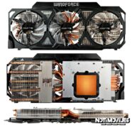 En Computex, GIGABYTE presentó su GeForce GTX TITAN con WindForce 3X paquete (GV-NTITANOC-6GD-B), en el que se obtiene un diseño de referencia aún en fábrica overclockeado tarjeta, y una solución de refrigeración WindForce 3X que DIY instala en el tarjeta usted mismo. Tanto la tarjeta y el refrigerador están agrupados en una sola caja grande. La tarjeta viene en fábrica overclockeado a 928 MHz core, 980 MHz GPU Boost, 6.00 GHz y la memoria.