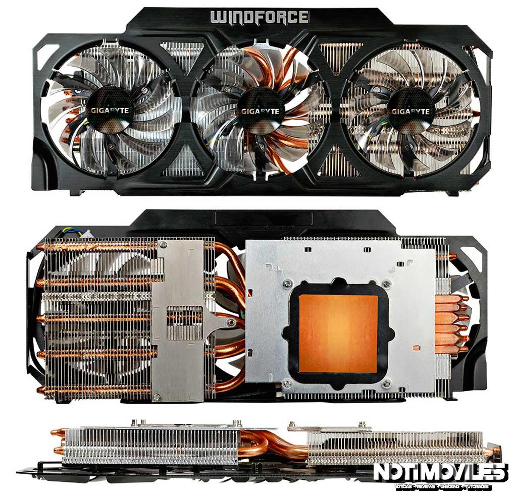 El enfriador 3X WindForce es complejo de aluminio de aleta pila disipador de calor, en el que dos pilas de aletas de aluminio del mismo tamaño extraer el calor de la GPU, utilizando cinco tubos de calor de cobre 8 mm de espesor. Estos son ventilados por un trío de 80 mm ventiladores suspendidos en una cubierta metálica.