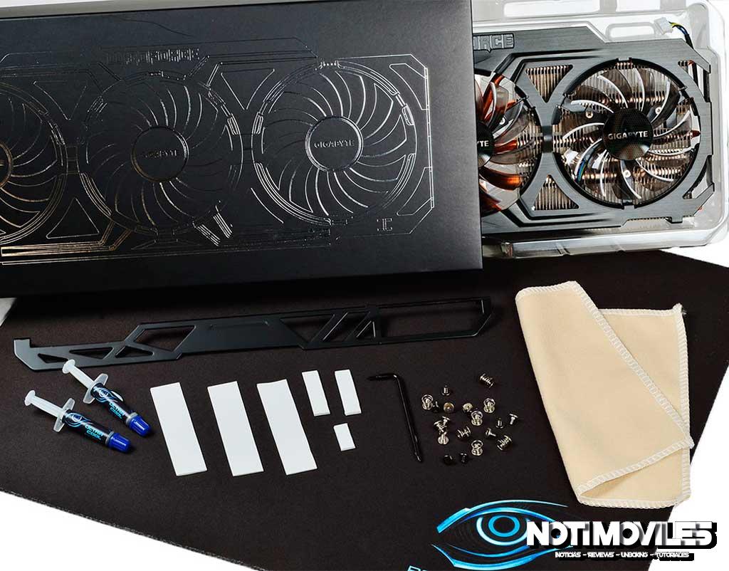 Incluido en el paquete complementario son almohadillas térmicas para la memoria y VRM, dos jeringas de TIM, tornillos, arandelas, una llave allen y un gran mouse-pad. GIGABYTE podría costar la tarjeta en un premio.