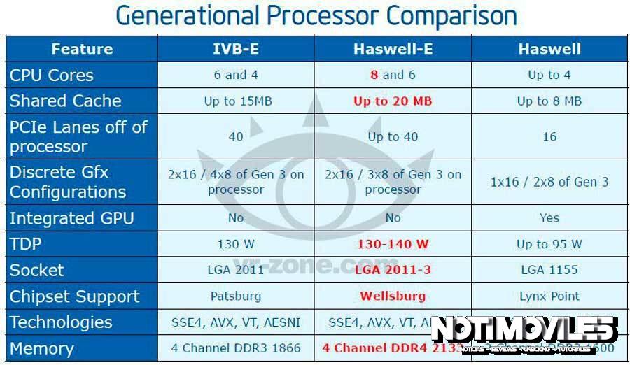 A juzgar sólo por eso, Haswell-E debería constituir una actualización muy superior sobre Ivy Bridge-E, en comparación con lo que éste estará en relación con Sandy Bridge-E, Haswell-E ofrece dos núcleos físicos adicionales que se traducen en cuatro hilos de ejecución adicionales . Los nuevos chips cuentan con 2,5 MB de caché L3 por núcleo, que suman 20 MB de caché L3 total de las 8 partes principales. TDP se mantendrá en el mismo barrio que fue en el caso de sus predecesores, en torno a 130 a 140 W.