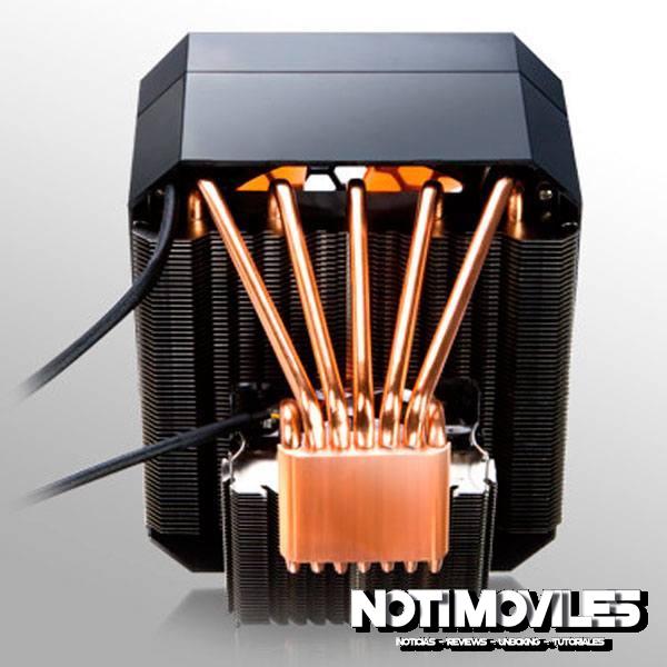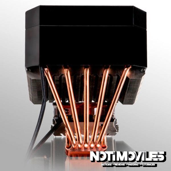 El refrigerador se encuentra en una base de cobre sólida de la cual siete 6 tubos de calor mm conducen el calor en dos pilas de aleta distintas, los cinco tubos de calor centrales alimentan el, más grande pila aleta de aluminio superior, que es enfriado por un ventilador de 140 mm PWM a girar a 800-1200 rpm, mientras que los dos tubos de calor periféricos conducen el calor en una aleta de aluminio más pequeña pila, situada por debajo de la más grande, y de ser enfriada por su propio ventilador 80 mm PWM con una velocidad máxima de 2000 RPM.