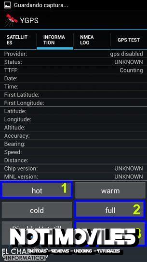 Una vez finalizada la descarga, volvemos al paso anterior, nos situamos en la pestaña “Localitation“, pero esta vez accedemos a “YGPS“. Una vez dentro, pestaña “Information” y por orden, pulsamos “hot“, “full” y “AGPS restart“.