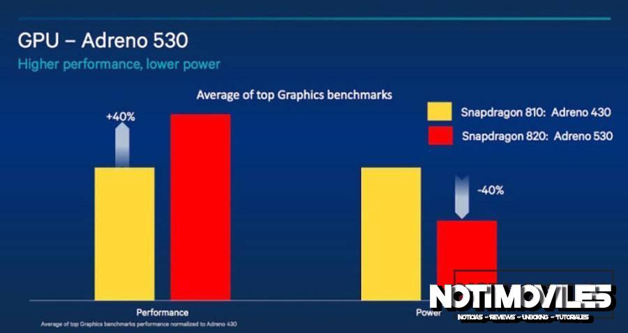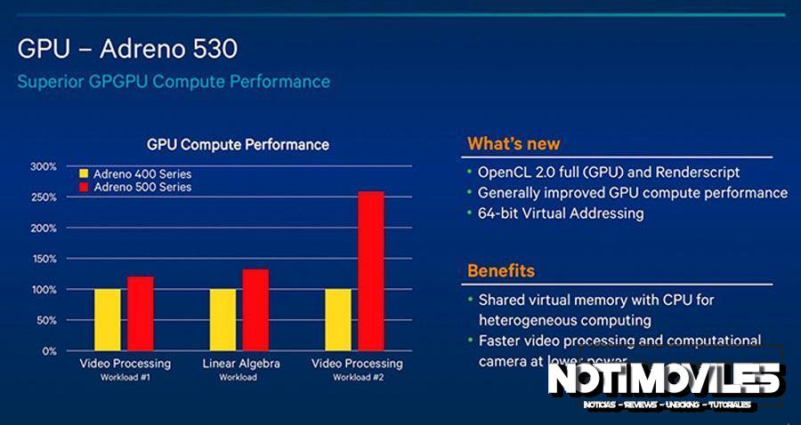 En el apartado gráficos tenemos a los ya anunciados Adreno 530, que prometen ser un 40 por ciento más rápidos con un 40 por ciento en la reducción de consumo respecto a los Adreno 430 que podemos encontrar en el SoC Snapdragon 810. Soportará la API OpenCL 2.0, OpenGL ES 3.1, Vulkan y el Android Extensión Pack, lo que añadirá ventajas bajo procesos GPGPU y el procesado de vídeos.